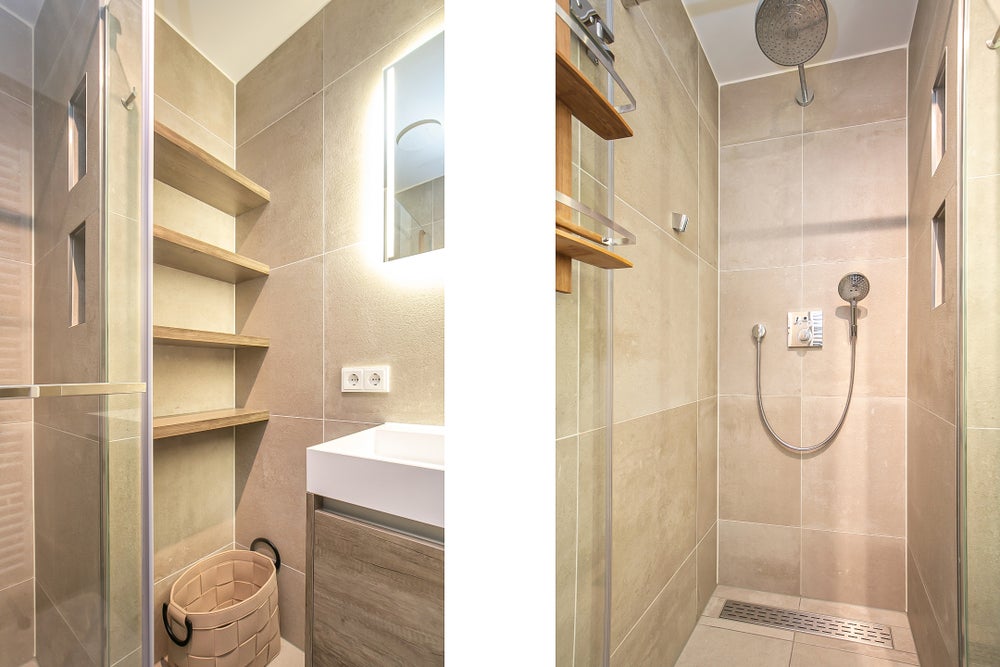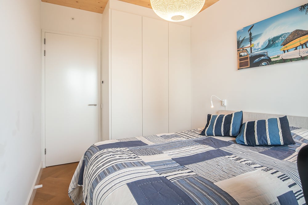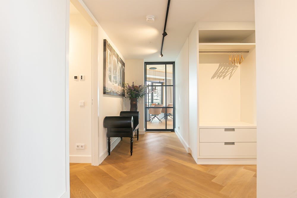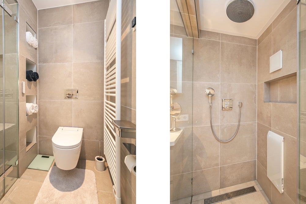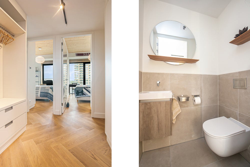 In de hal kunnen we naast de doorgang richting de woonkamer ook rechts afslaan waar zich twee ruime slaapkamers bevinden. Er is een bureau aanwezig zodat thuiswerken of zaken vanuit huis doen, tot de mogelijkheden beschikken. We treffen in de hal ook een wc, waarvan het licht automatisch aangaat en een tweede badkamer voorzien van luxe douche.