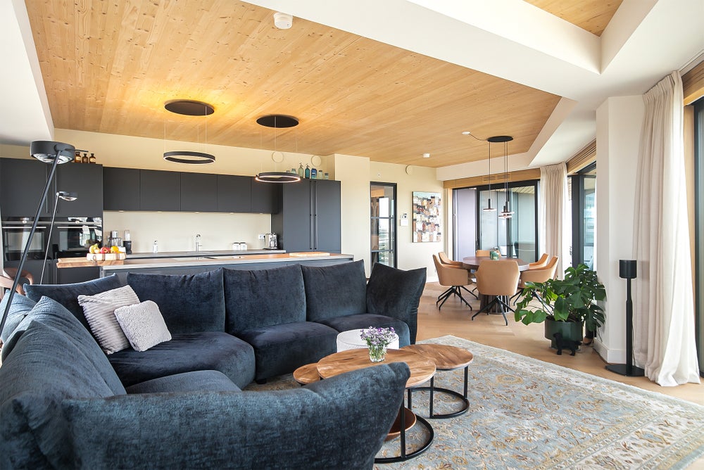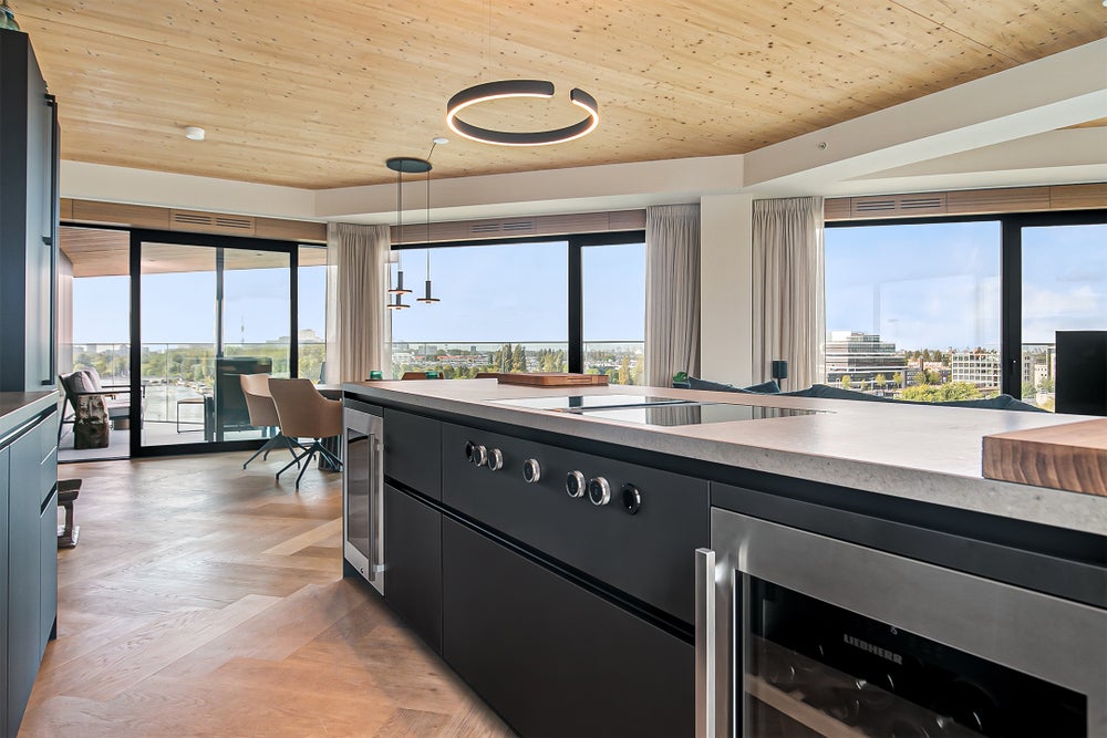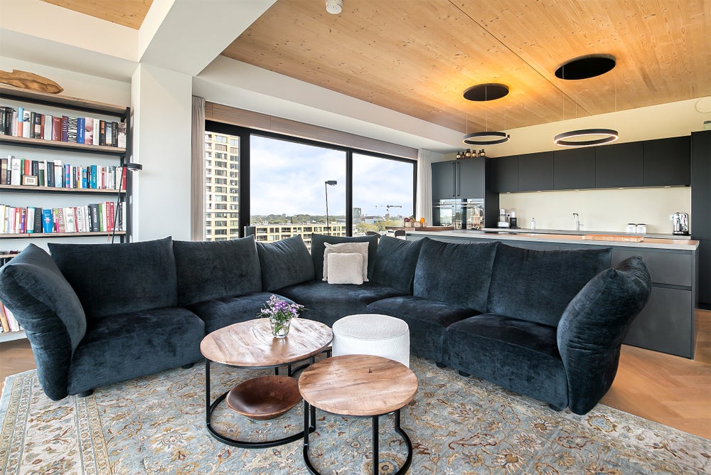 Het appartement is van alle gemakken voorzien. We beginnen in de woonkamer, met panoramisch uitzicht over de Amstel, waar u een visgraat parketvloer aantreft en tevens zeer nette meubilering zoals een chique Italiaanse EDRA bankstel en groot eettafel met luxe stoelen. Ook is de woonkamer voorzien van elektrische zonweringen en zoals in overige vertrekken ook het geval zowel vloerverwarming en vloerkoeling. De grote schuifpui brengt u naar het royale dakterras met zitgelegenheden van het Italiaanse merk Manifesto.