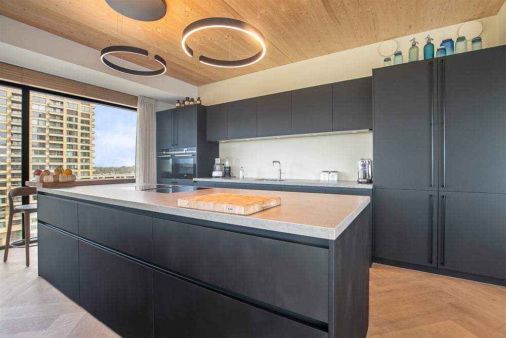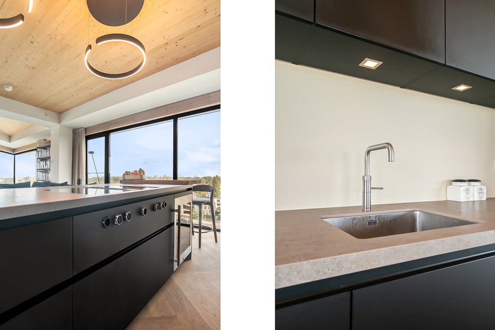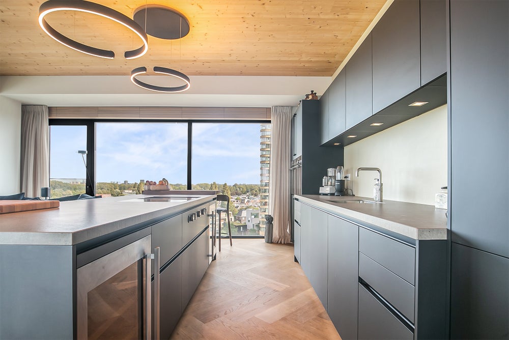 Als we terug in de woonkamer even verder kijken, treffen we een ongeëvenaarde keuken aan van architectuur keukenspecialist Leight, deze beschikt over gloednieuwe moderne keukenapparatuur van het merk Siemens. De 2 separate wijnklimaatkasten zijn afkomstig van het merk Liebherr voor zowel rode als witte wijn. Ook zijn er dubbele vriezers/koelkasten en verschillende soorten mixers en blenders aanwezig.
