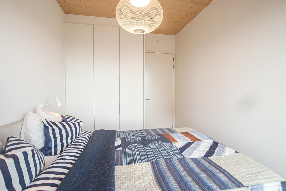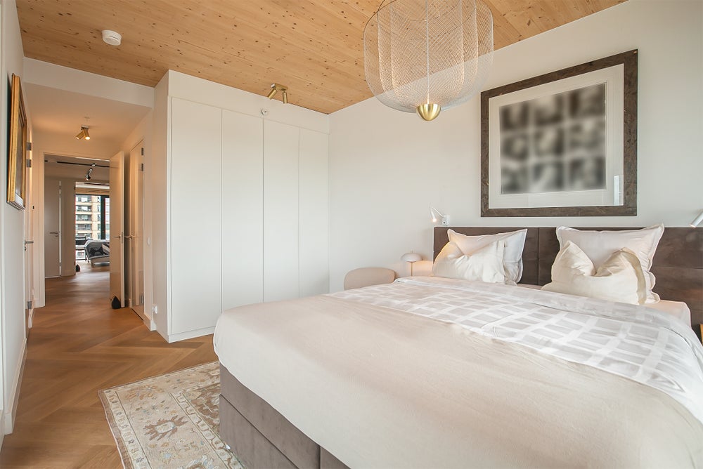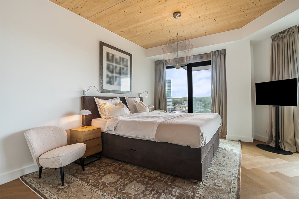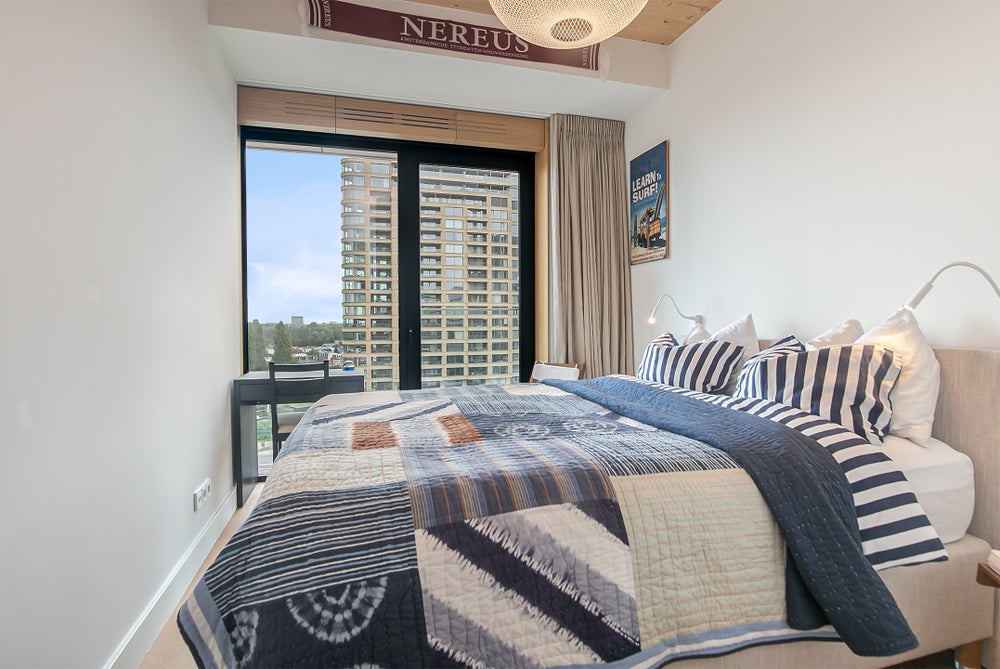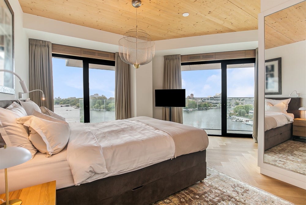 Als we doorlopen in de gang treffen we de grote badkamer aan, met groot bad en tevens een luxe sauna/stoomcabine en toilet. U komt in dit appartement werkelijk niks te kort. Naast de badkamer bevindt zich tevens de grote slaapkamer. Deze beschikt ook over het panoramische uitzicht over de Amstel. Als u in de ochtend uw deur opendoet staat u met slechts één stap op het terras waar u heerlijk kunt genieten van de krant en uw kop koffie!