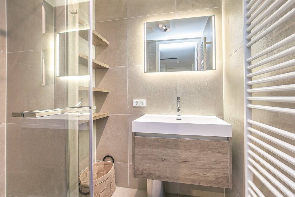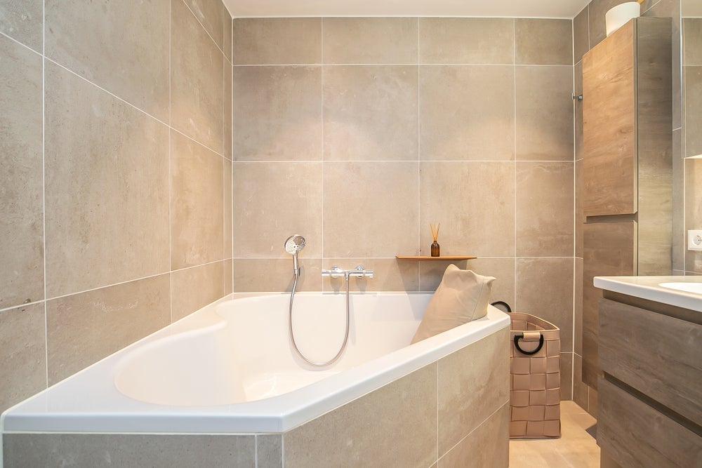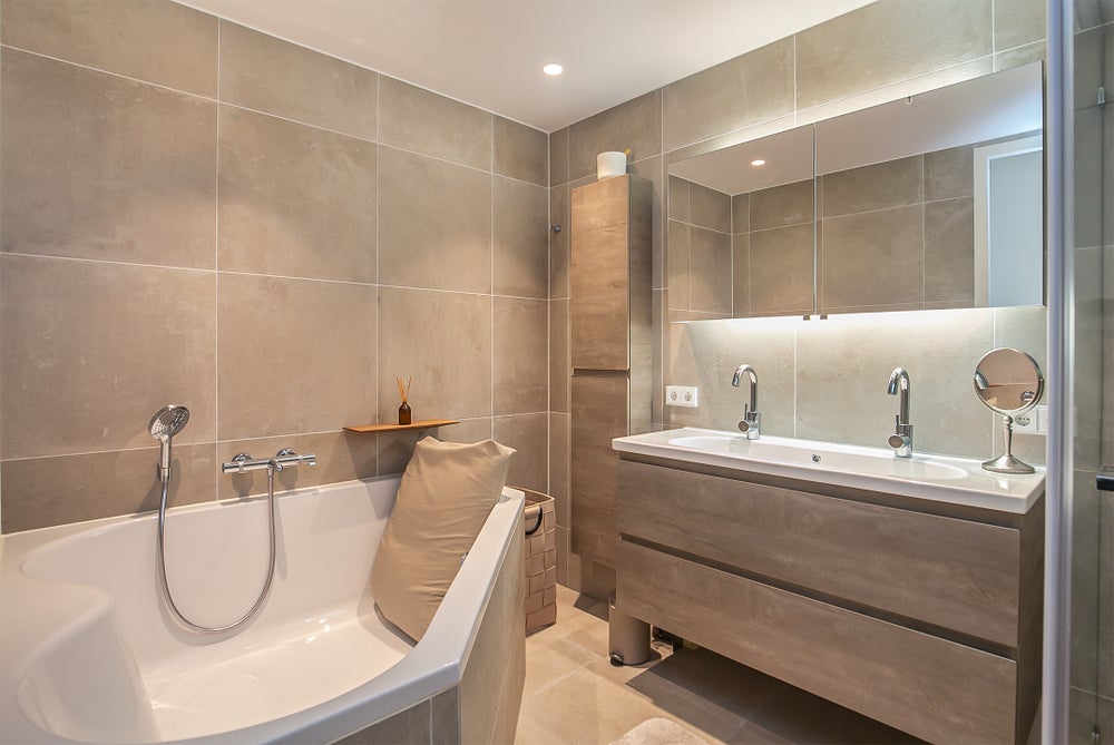 Ligbad, zitbad, toilet, douche, bidet, stoomcabine, dubbele wastafel, wastafelmeubel, inloopdouche, vloerverwarming geheel